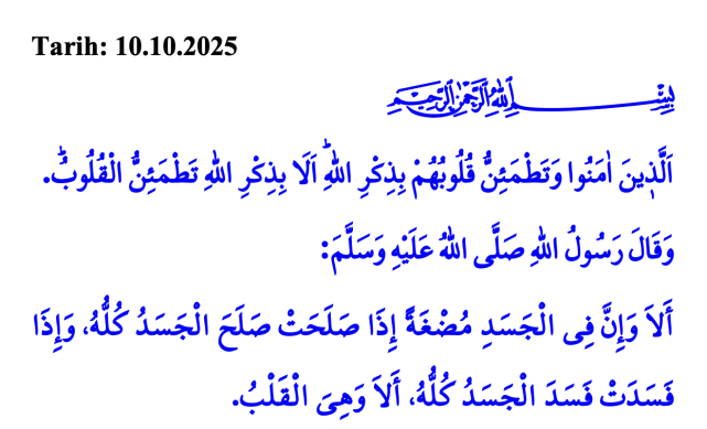 Kalp; Cenâb-ı Hakk’ın nazargâhıdır. İman ve takvanın, irfan ve hikmetin mekânıdır. Nezaket ve zarafetin membaı, ilâhî aşkın ve muhabbetin mihenk noktasıdır. Kalp; sevgi ve nefretin, cesaret ve korkaklığın, iyilik ve kötülüğün, hâsılı bütün duyguların merkezidir.Kıymetli Müslümanlar!