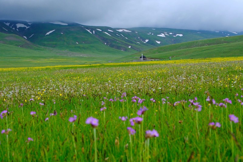 Bahar mevsimiyle birlikte coğrafyasının yüzde 60'ını oluşturan dağlarının renkten renge büründüğü Gümüşhane'de Çimen Dağı eteklerindeki turnalarıyla, sarı çiçekleriyle, çayırlarıyla ünlü Cami Yurdu yaylası alabildiğince sarı renge büründü.