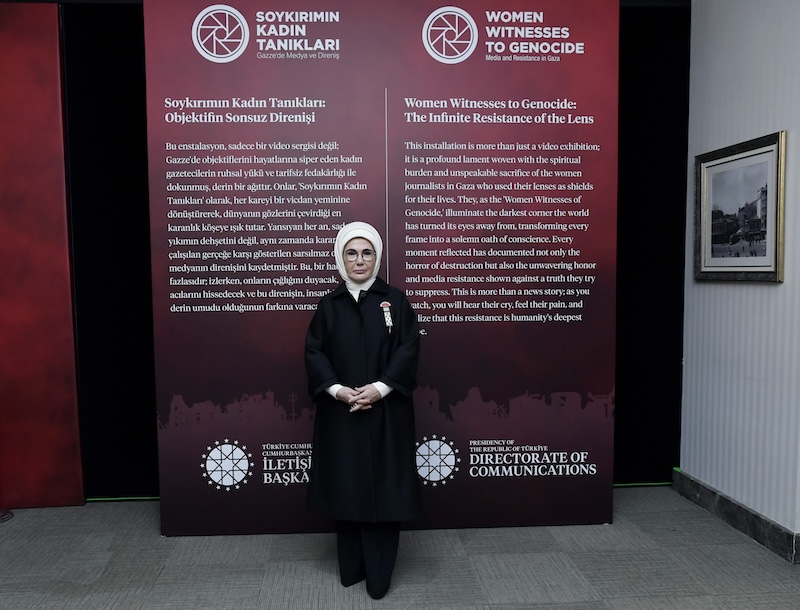 Emine Erdoğan, Cumhurbaşkanlığı İletişim Başkanlığı tarafından düzenlenen "Soykırımın Kadın Tanıkları: Gazze'de Medya ve Direniş" programına katıldı. İletişim Başkanlığına gelişinde Aile ve Sosyal Hizmetler Bakanı Mahinur Özdemir Göktaş ve Cumhurbaşkanlığı İletişim Başkanı Burhanettin Duran tarafından karşılanan Emine Erdoğan, İsrail'in Gazze'ye saldırılarında hayatını kaybeden gazetecilerin fotoğraflarının yer aldığı alanı gezdi.
