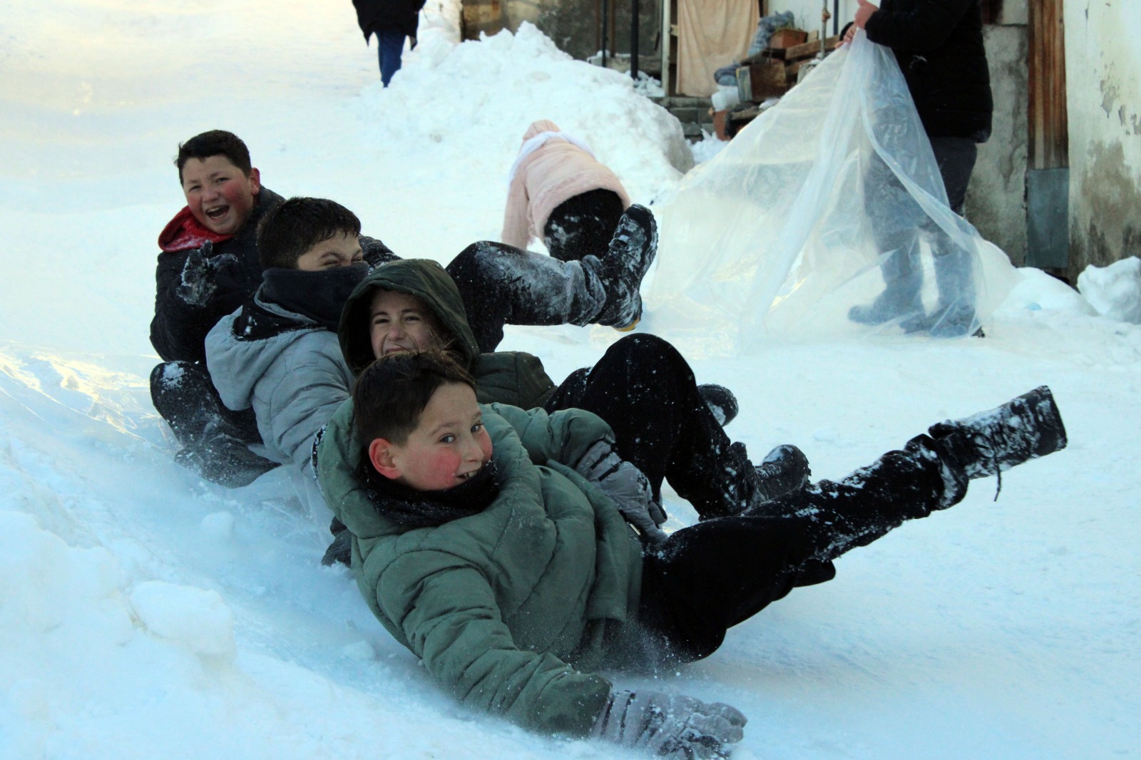 Kastamonu'nun Azdavay ilçesinde çoğunluğu ilkokul ve ortaokul çağında olan çocuklar, mahalle arasına yaptıkları kızak pistinde naylonlarla kayarak karın tadını çıkardı. Bölgede bir süredir etkili olan kar yağışı nedeniyle Azdavay'da kar kalınlığı yer yer 1 metreye yaklaştı. Şehitler Gaziler Parkı'nın yanındaki Karanfil Sokağı'nın dik yollarını kendi imkanları ile düzelterek kızak pistine çeviren mahallenin çocukları, poşet ve naylonlarla kayarak keyifli anlar yaşadı.