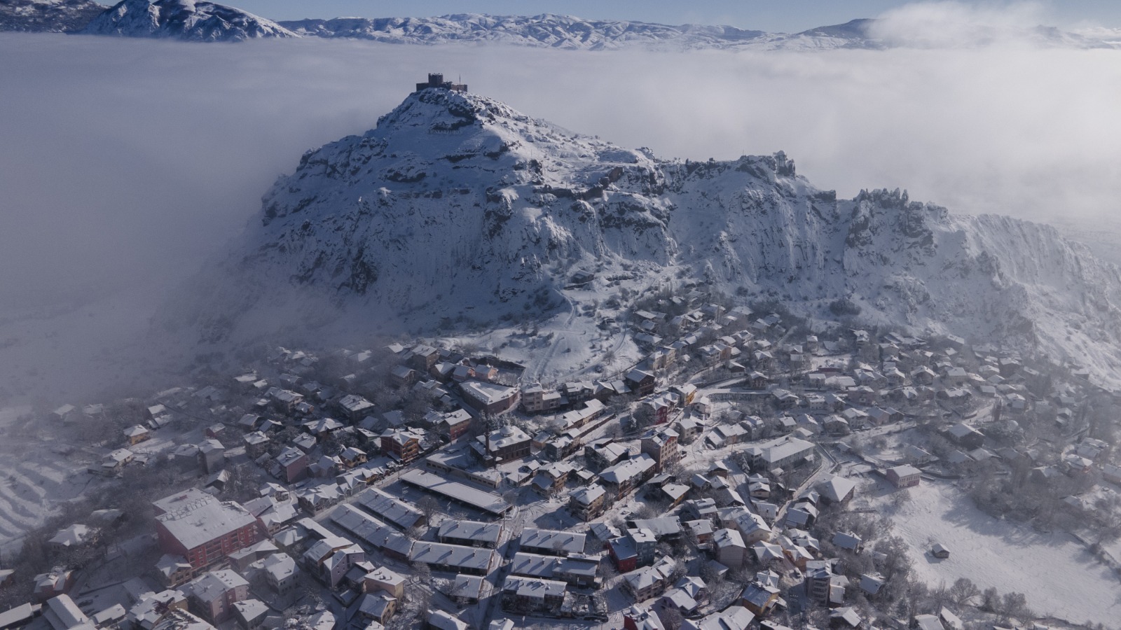 Giresun'un Şebinkarahisar ilçesinde kar yağışının ardından etkili olan sis etkili oldu. Tarihi Şebinkarahisar Kalesi ile ilçe merkezi beyaz örtüyle kaplandı.