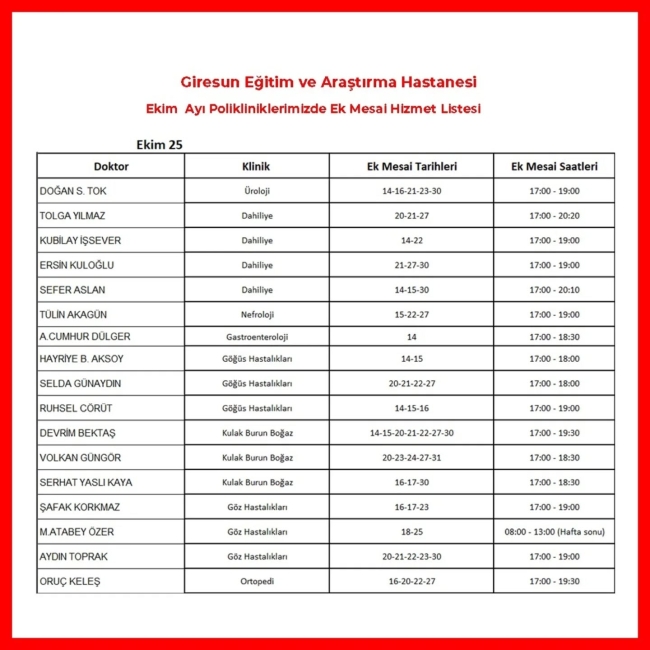 Giresun Eğitim ve Araştırma Hastanesi'nden yapılan açıklamaya göre, Üroloji, Dahiliye, Nefroloji, Gastroenteroloji, Göğüs Hastalıkları, Kulak Burun Boğaz, Göz Hastalıkları ve Ortopedi branşlarında belirlenen gün ve saatlerde ek mesai kapsamında poliklinik hizmeti sunulmaya devam edilecek.