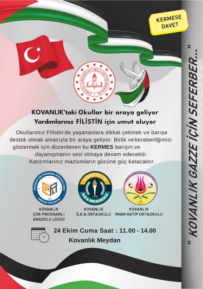 Bulancak İlçe Milli Eğitim Müdürü Şenel Bulut’un da destek verdiği organizasyon kapsamında, Kovanlık’taki okullar bir araya gelerek “Kermes” etkinliği düzenliyor. Etkinlikten elde edilecek gelir, Filistinli ihtiyaç sahiplerine umut olacak.